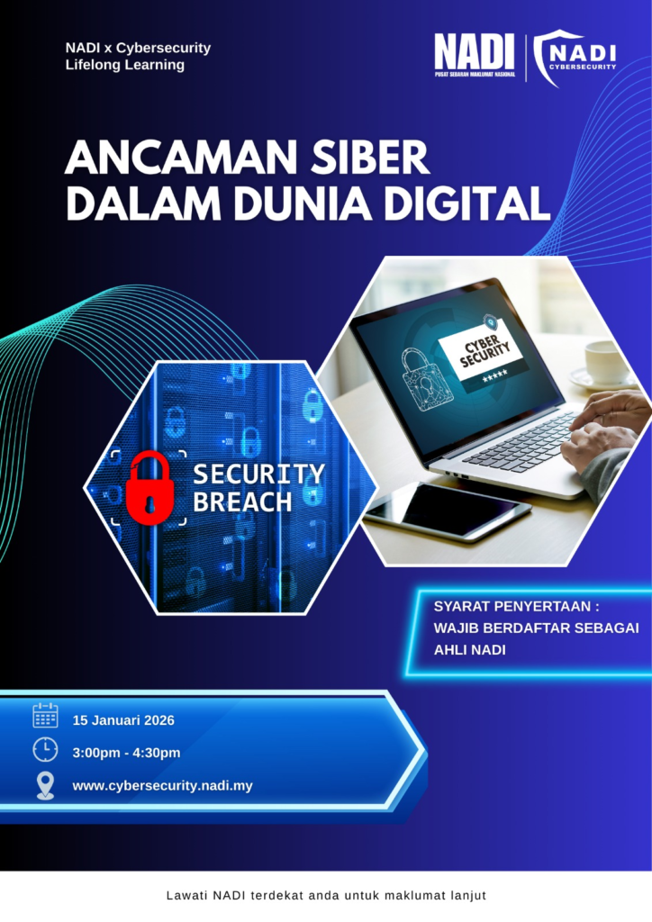 Webinar NADI x Cybersecurity bertarikh 15 Januari 2026 yang bertajuk Ancaman Siber Dalam Dunia Digital. Butiran lanjut adalah seperti dibawah: