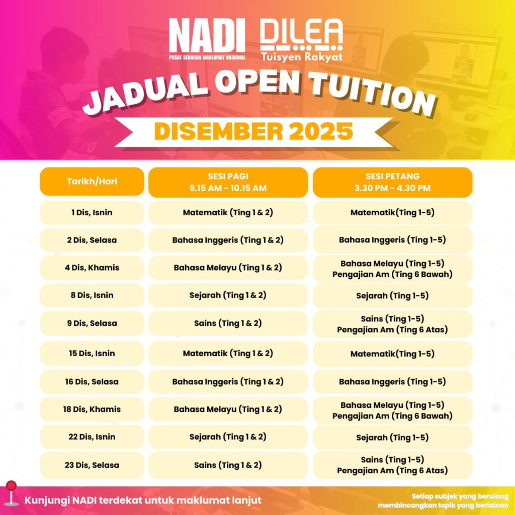 Assalamualaikum dan selamat sejahtera, berikut merupakan maklumat jadual Open Tuition Dilea bagi bulan Disember 2025