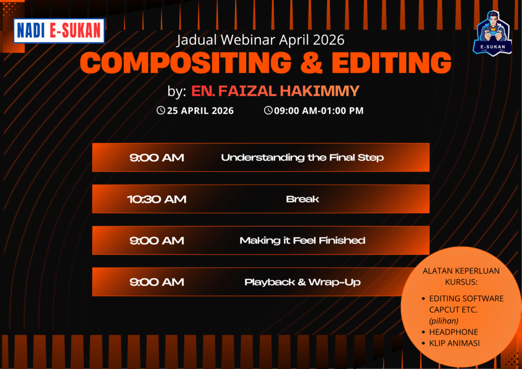 Webinar ini bertujuan memberi pendedahan mengenai asas compositing dan editing, termasuk teknik penyusunan visual, penggabungan elemen, aliran suntingan serta proses akhir dalam menghasilkan kandungan animasi dan video yang lebih kemas dan profesional.